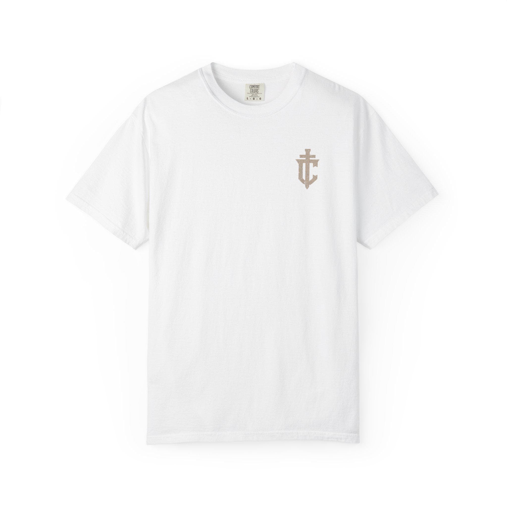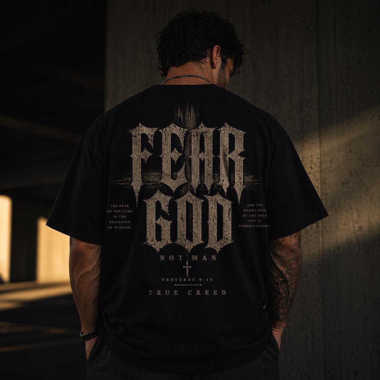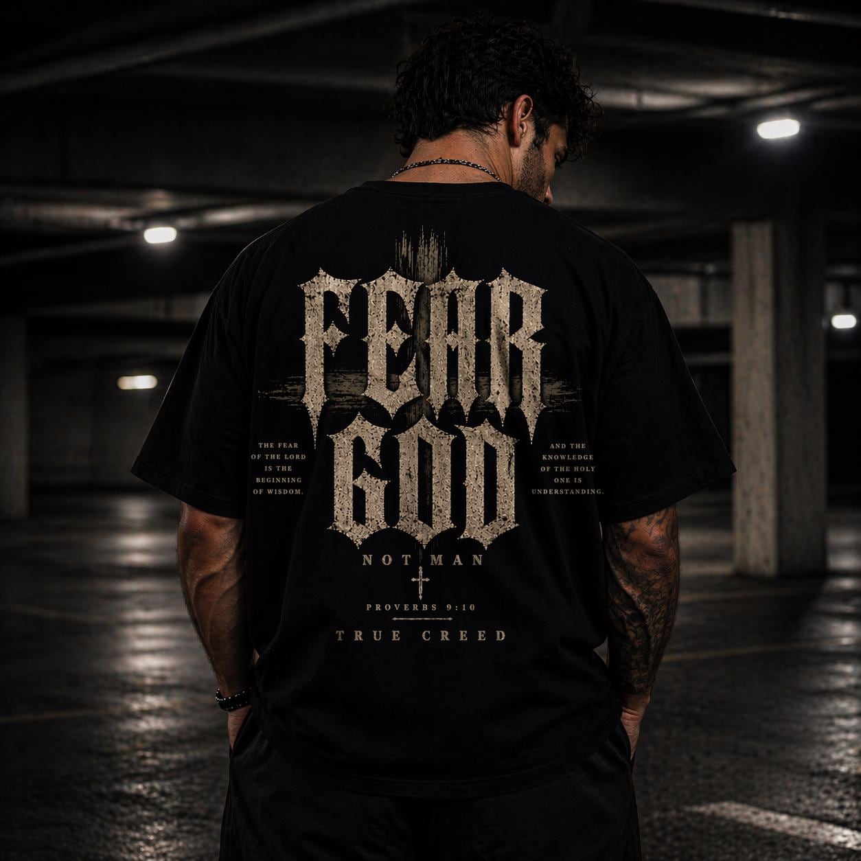 A heavyweight, garment-dyed tee that feels like it’s already lived a hundred meaningful days. The soft, muted dye and relaxed cut create a worn-in silhouette that settles naturally on the shoulders. A small, rugged emblem on the chest pairs with a bold, distressed graphic across the back that reads “FEAR GOD” in vintage-inspired typography, layered with subtle texture and symbolic motifs. This shirt carries a quiet, reverent edge — made to be worn to late-night bonfires, church youth nights, or when you want your faith expressed with grit rather than gloss. The thick, ring-spun cotton and reinforced seams give it real staying power; the sewn-in label and tubular knit keep the look clean and timeless. If they’re into faith-forward streetwear with a lived-in feel, this tee becomes part of the rotation fast.