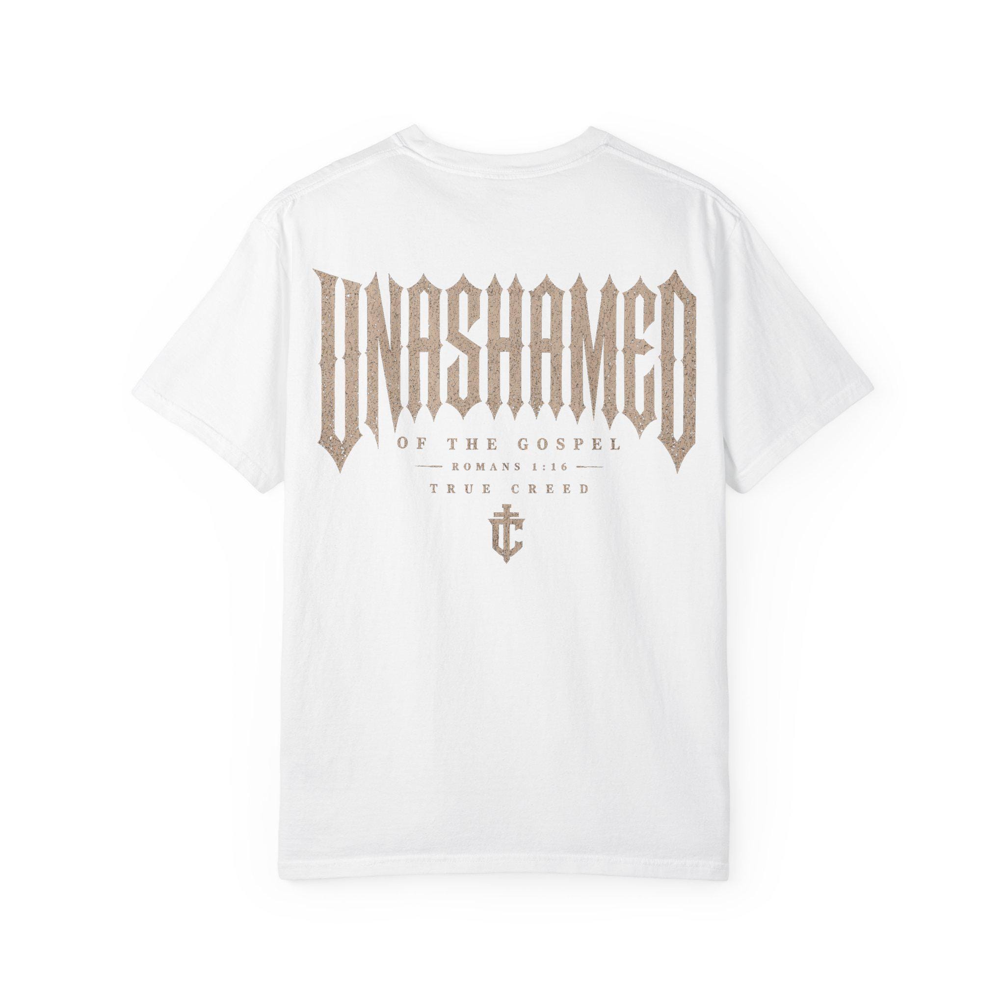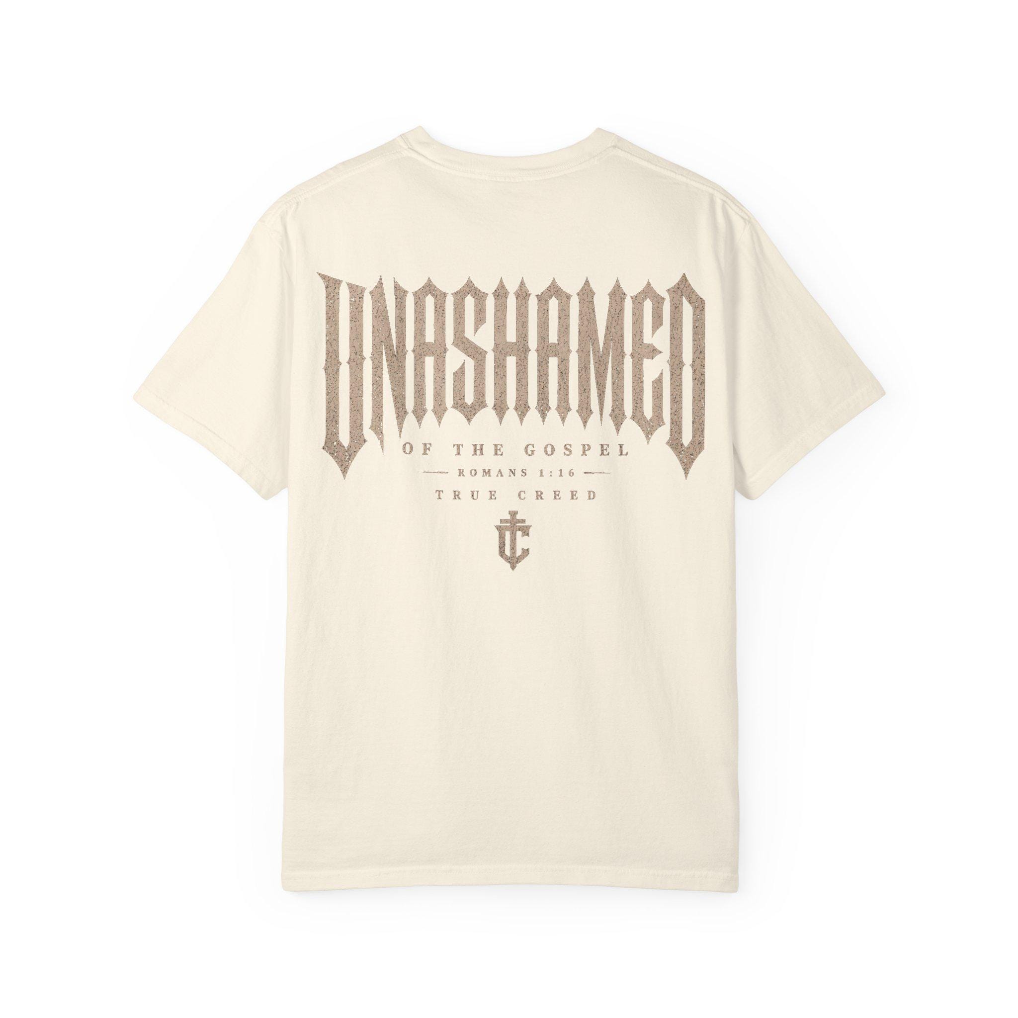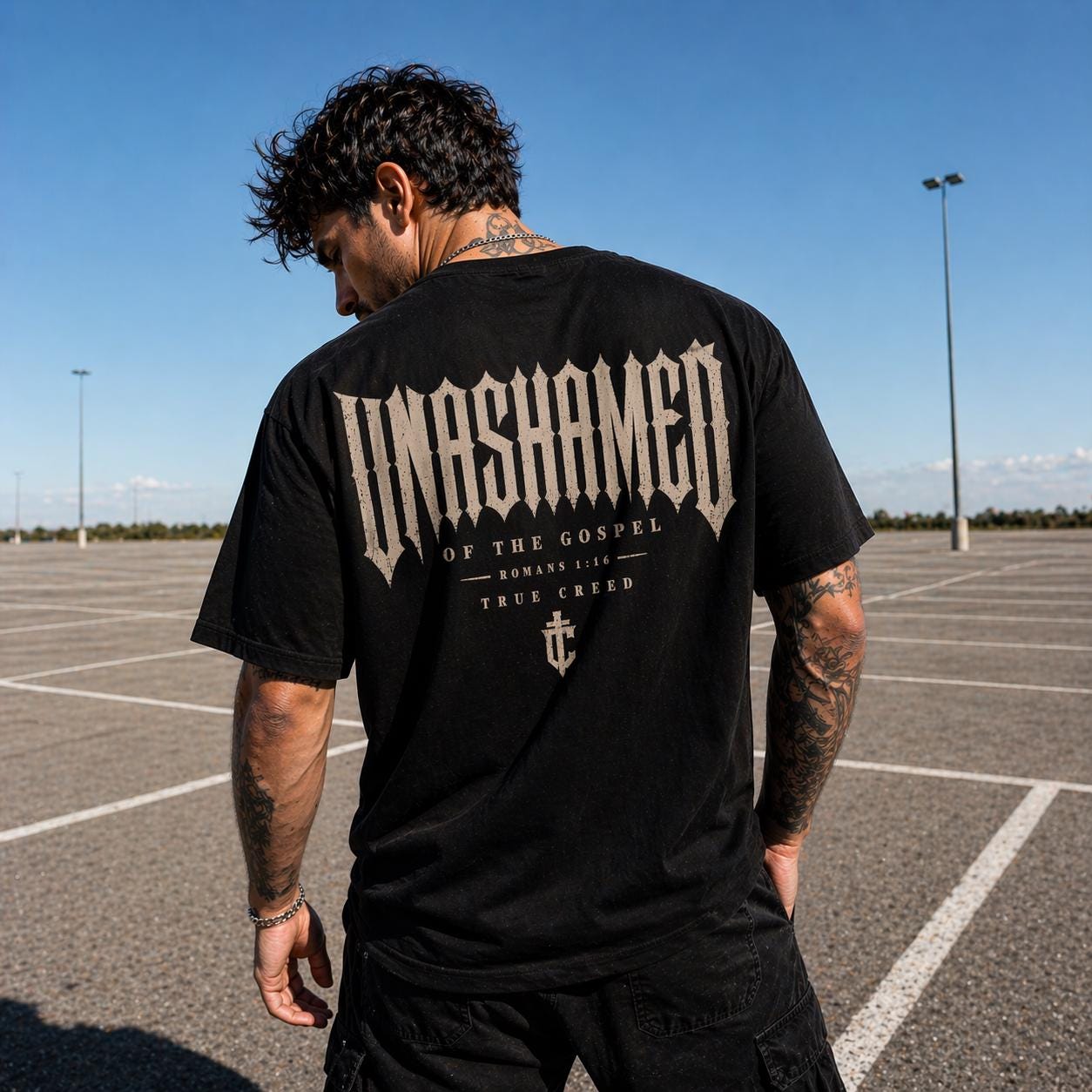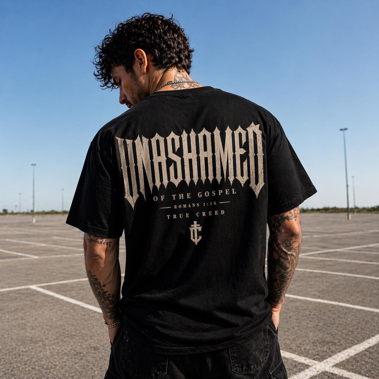 Featuring a subtle, small emblem on the front chest and bold, angular lettering across the back, this faith shirt balances understated style with a powerful message. The striking "Unashamed" design boldly proclaims your beliefs, making it an ideal Christian tee for men who want to wear their faith proudly. Whether paired with faded denim, work boots, or layered under a flannel for cooler evenings around a bonfire, this Christian streetwear makes a statement.