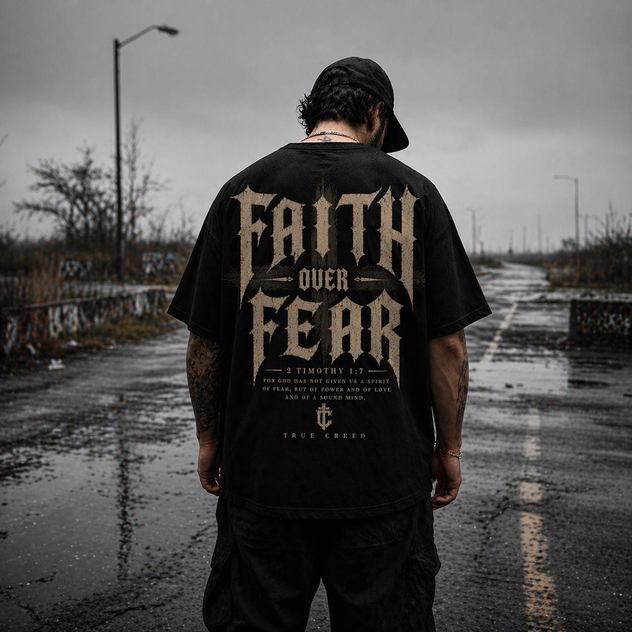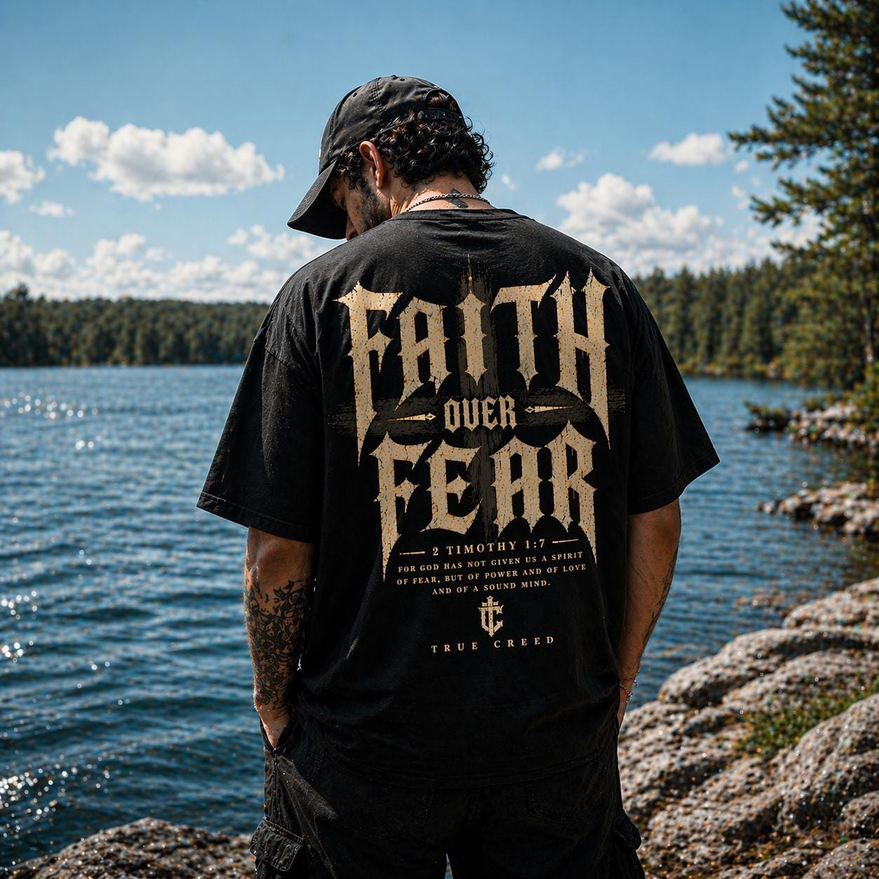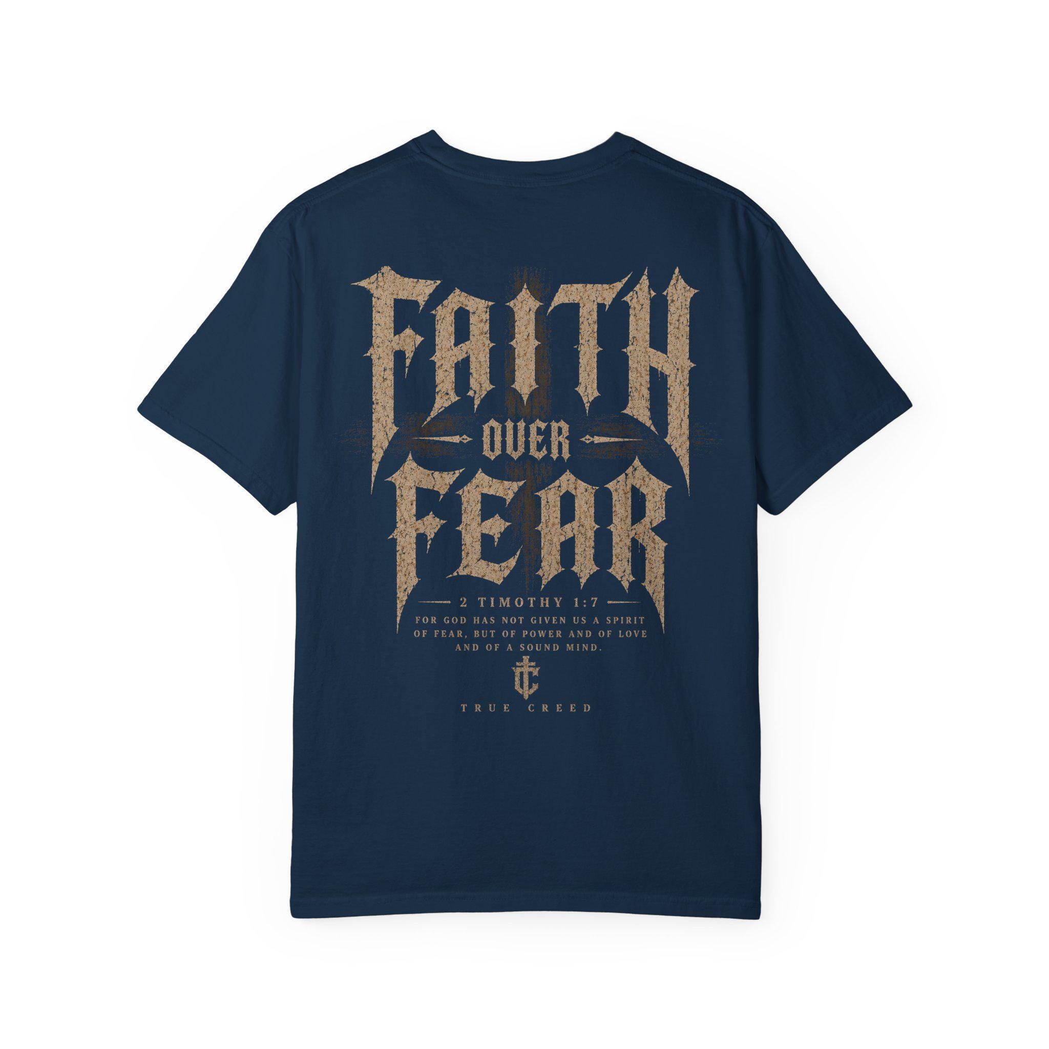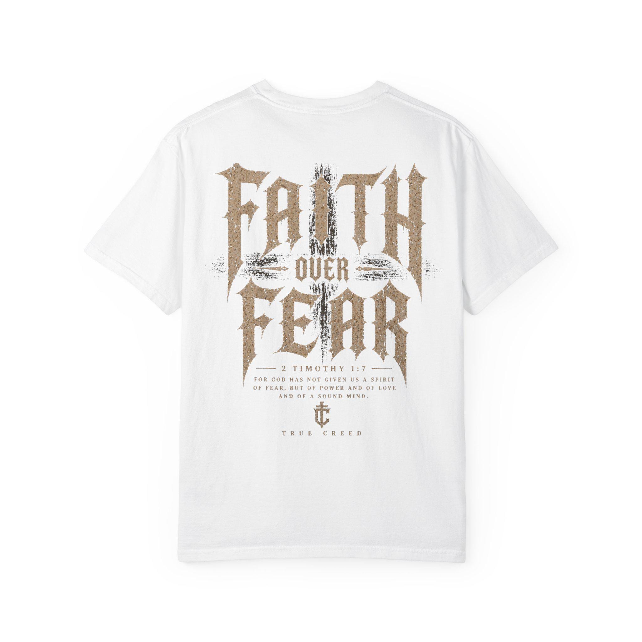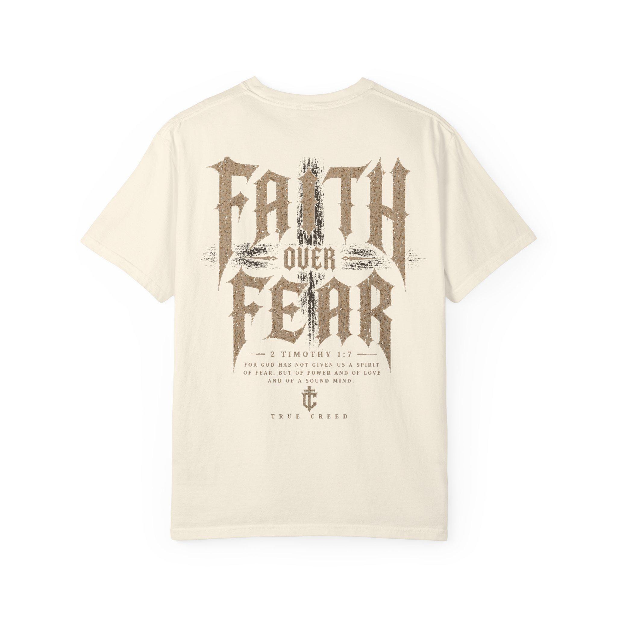 This relaxed-fit garment-dyed tee carries a quiet strength — soft, broken-in color and heavyweight cotton that feels lived-in from the first wear. A small, tasteful emblem rests over the heart, while the back declares “Faith Over Fear” in weathered, vintage-inspired lettering accented with subtle feather and wheat motifs. Wear it when you want your convictions to speak without shouting: layered under a jacket for a road trip, thrown on for a Sunday morning at the coffee shop, or packed for a retreat where conversation and calm matter more than appearances. The fabric settles against your skin, the dye gives each piece slight, unique variation, and the roomy cut keeps movement easy — built to be worn, washed, and lived in.