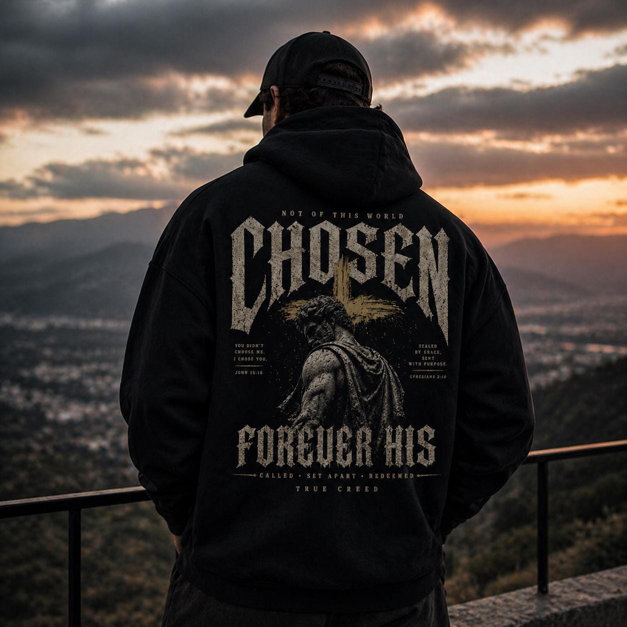 This heavyweight hoodie carries a quiet, resolute presence. The front features a small, embroidered emblem over the heart, while the back opens into a weathered, vintage-style graphic of a guardian angel and bold, distressed lettering reading "CHOSEN" and "FOREVER HIS." Wear it when you want shelter from the cold and a piece that speaks to faith, conviction, and steady devotion. The fabric is soft but substantial — a lived-in feel from the first wear — with a roomy hood and deep kangaroo pocket that keep hands warm and pockets full. It settles into everyday life: layered over tees for morning coffee runs, pulled on after evening services, or worn while driving across town to clear your head. The muted, aged tones of the print let the message read as personal and understated, not loud; it pairs naturally with worn denim and workboots or leggings and sneakers, depending on the rhythm of your day.